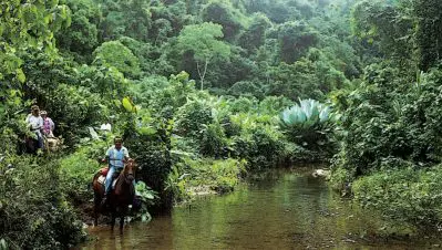 If you are seeking a vacation in a nearby foreign country with a good winter climate, horseback riding in Belize may be the answer for you. Its glorious beaches are well known, but the hill country in the interior offers hidden treasures. English speaking Belize is only a two hour flight from the southern United States and yet it is like entering a world as different as Africa. It is the home of rare and beautiful birds, gorgeous wild orchids and huge butterflies. There are many interesting caves and you will have a chance to ride to one formed by an underground river which flows through it. In other caves you will find Mayan pottery chards among the bizarre shapes of stalagmites and stalactites. Your experienced guides are well informed about local history, flora and fauna and will take you on jungle trails riding Quarter Horse crosses well adapted to the terrain. There are open areas with good footing for occasional canters and lovely, secluded waterfalls which create ideal pools for you to take a swim and have a picnic. The ride is moderately paced and does not require great equestrian skill. Many other activities for non-riders are available like bird watching, cave exploring, rappelling and visiting Mayan ruins.