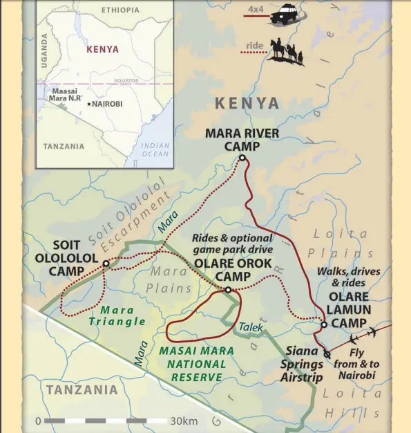 You will be collected from your hotel in Nairobi, or directly from the international airport. Transfer to Wilson Airport (the domestic airport in Nairobi) to catch the 10:00am scheduled flight or 10:30am charter flight to the Mara. It is a beautiful flight passing the fertile Kikuyu Highlands before reaching the Great Rift Valley and then the Loita Hills and Naibosho airstrip. Here you are met by your guide for the drive to camp, your first chance to observe the abundant wildlife. The first camp is located on the banks of the Mara River adjacent to a teeming hippo pool. Lunch will be served and you’ll have some time to relax before meeting the horses and setting of on your first evening ride. (about 2 hours riding) Overnight Mara River Hippo Camp.