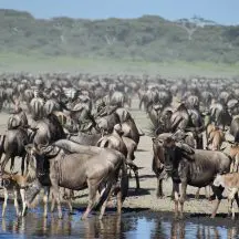 This year in the Serengeti was perhaps my favorite ride ever. Catching up with the famous wildebeest and zebra migration of 1.3 million animals is a hit and miss affair, because it is totally dependent on rainfall. The rains do sometimes fail and the vast herds become scattered, but usually they are gathered in the southern Serengeti at this time, where ancient volcanic activity has created mineral-rich soil. The wildebeest come here to drop their calves, which takes place over a period of 3 weeks. It is amazing to watch the newborns get up on unsteady legs and then canter off with their mothers within a matter of 2 minutes. The abundant source of easy prey draws predators such as lion, hyena, wild dogs and jackals, which makes for exciting game viewing.