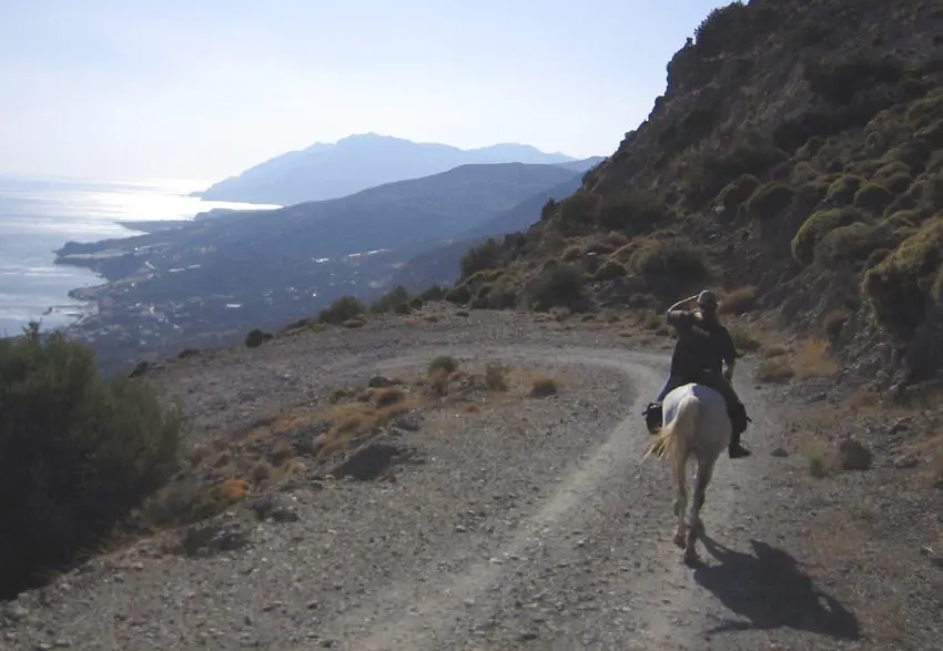 Horseback riding in Greece offers one of the most attractive bargains in Europe. The best place to go in the Greek Archipelago is the island of Crete. It is the largest of the Greek islands and lies between Europe and North Africa which gives it an agreeable, temperate climate, attracting tourists year around. The interior of the island is made up of fertile valleys with olive groves, vineyards, vegetables and fruit surrounded by rugged mountains going up to 7,000 ft. offering interesting, varied terrain for riders which your sure-footed horses handle with ease. You will pass through remote hillside villages where peasants still use donkeys to help them farm. Riders can enjoy the adventure of steep trails and fast canters in the valleys. The wild scenery is magnificent and the island is surrounded by the clear blue of the Mediterranean Sea. There are fine beaches to ride on and chances to swim with your horse when weather permits.