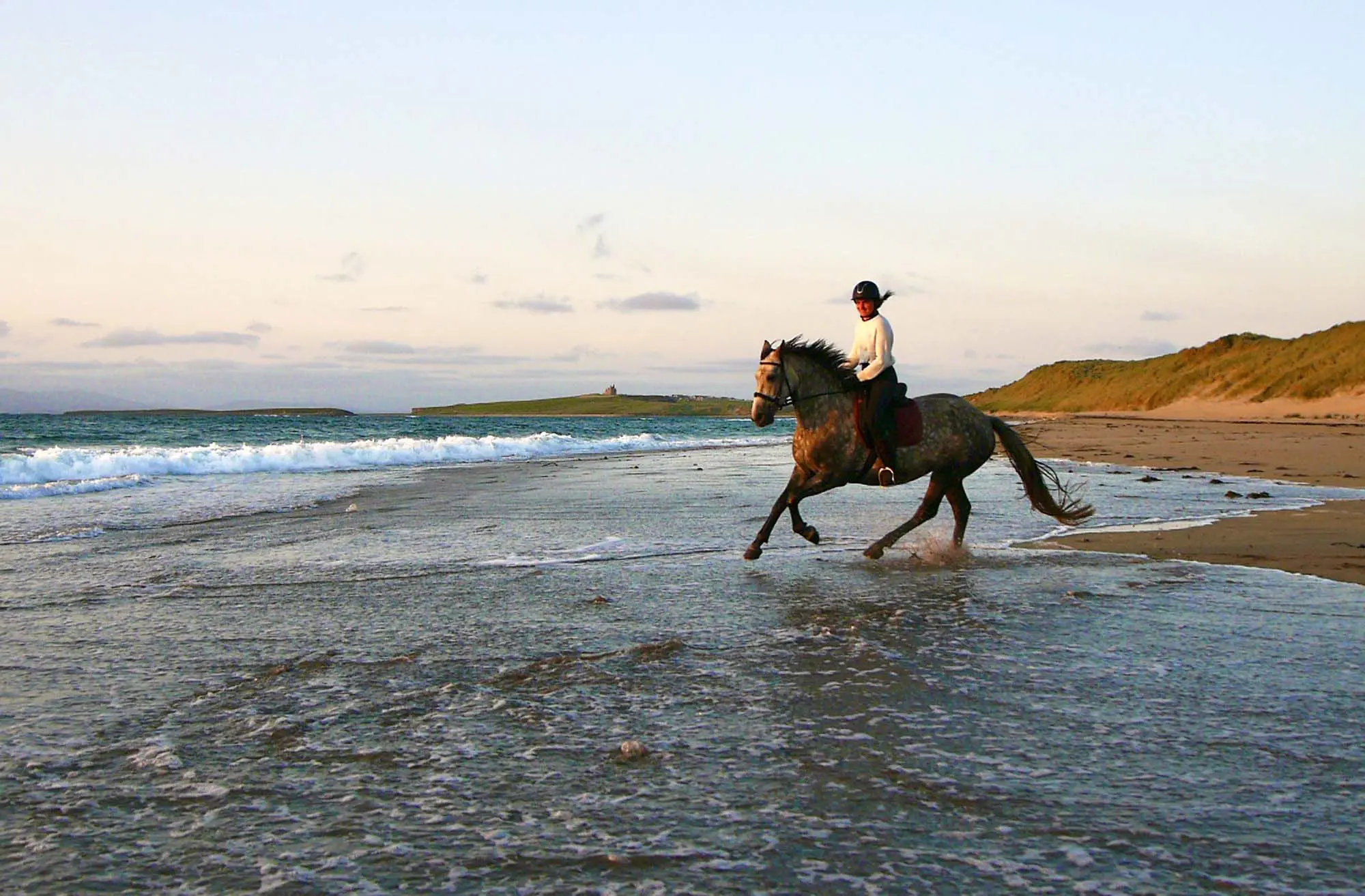 You will trek across the lagoon to Streedagh Beach where a fresh gallop will await the experienced riders. Three Spanish Armada ships were wrecked here at the Black Rock in 1588. You will explore the sand dunes on O’Connor’s Island, combining some brisk riding on the strand and a scenic stroll over the island with a stop-off in the pub for a pint as well as some hearty food. Seals and migratory birds can often be spotted in the estuary. Depending on tidal conditions, you will enjoy either a picnic or cafe lunch.