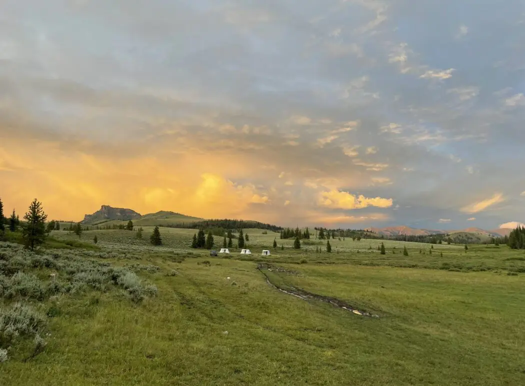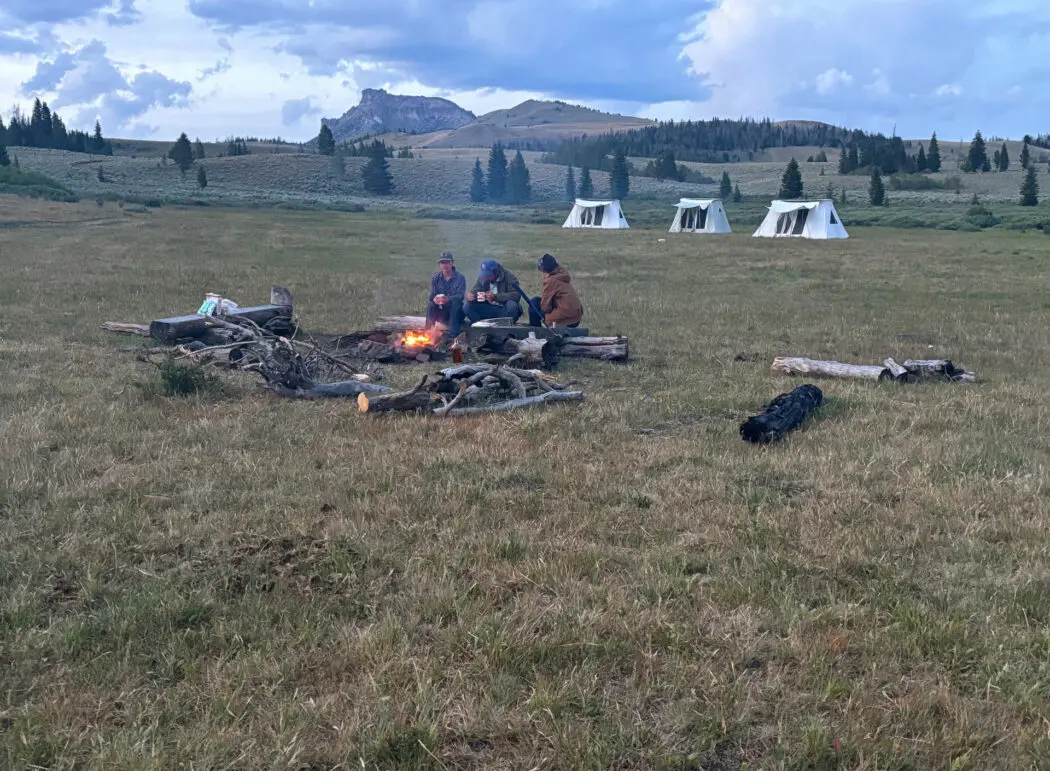 When you reach the camp, guests will pick out a tent and collect their belongings from the truck while your guides tend to the horses and set out refreshments. You’ll have some downtime to relax or explore before dinner. The vast majority of our cooking is done over an open cook fire, which guests are welcome to be part of. There is no fixed meal schedule but dinner is usually an hour or two before sunset. The entrees are pre-prepared by the professional chef at the ranch and range from cowboy chili to chicken cacciatore. After we eat, the cook fire becomes a campfire, where you can roast marshmallows, have a drink, enjoy lively conversation, or just look at the stars.