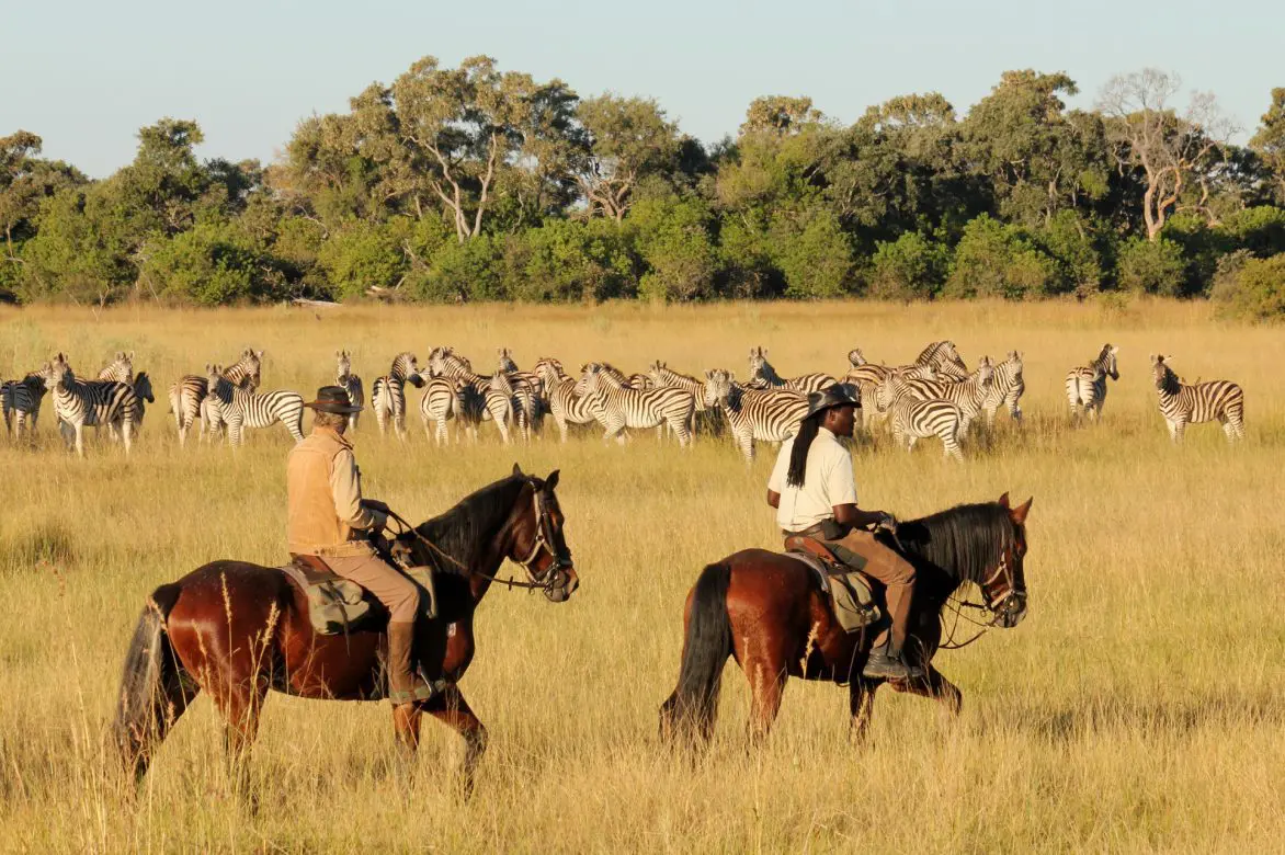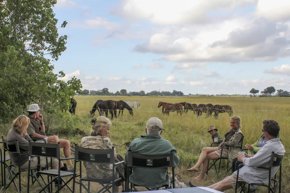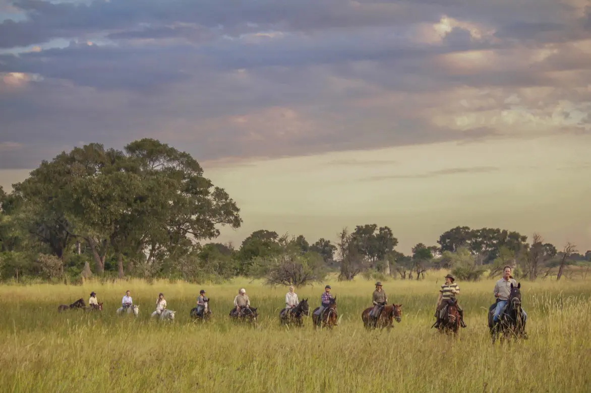 A typical day starts with an early wake-up call and a light breakfast around the camp fire as dawn breaks. The morning is spent on horseback, following ancient elephant trails, searching for a variety of wildlife, enjoying the prolific birdlife, and cantering through the recently flooded plains. Herds of buffalo may be in the vicinity, giraffe often saunter by and red lechwe splash through the water alongside, whilst kudu peer out from the thickets.