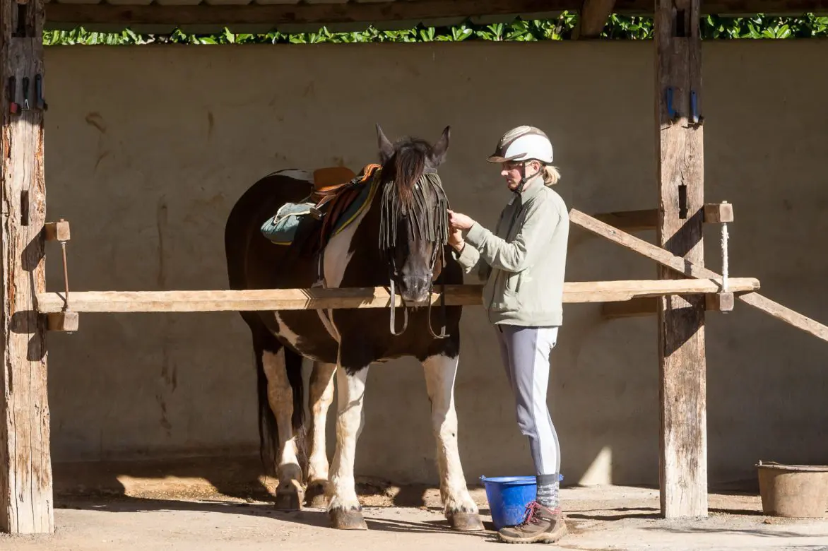 Have breakfast at about 8:30am, then go and get the horses from the field. Groom and tack to ride in the surrounding area.