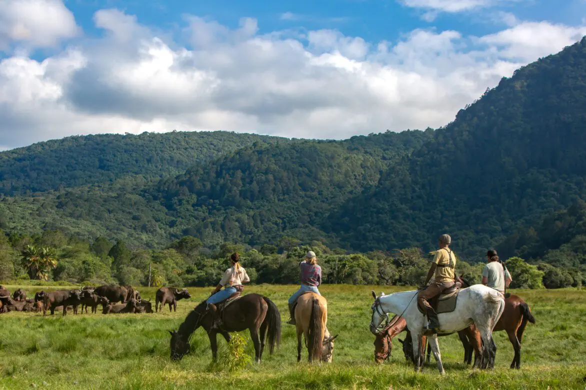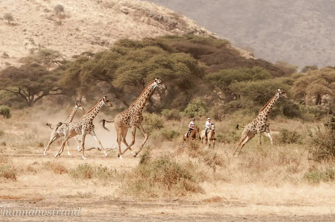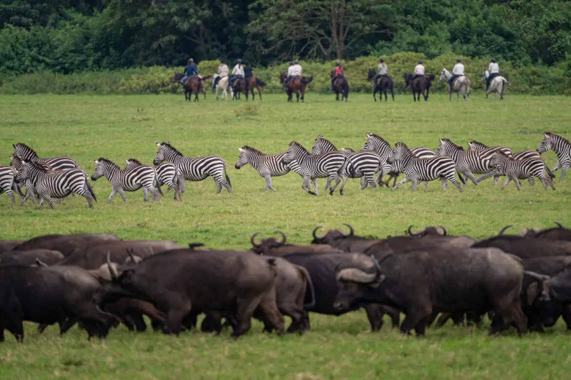 Wake up calls with tea and coffee, breakfast is served anytime from early hours. After breakfast the drive is about thirty minutes to Arusha National Park gate. Here the horses will be waiting, ready to be mounted and shortly after you ride into one of the most beautiful parks in East Africa. Here the vegetation will change dramatically, from open grassland to rainforest. There are good chances of seeing, buffaloes, giraffes – all your plains game, while elephants and leopards are present but harder to spot, along with rare species such as Suni, Red Duiker, the magnificent Hartlaub’s turaco, colobus monkey and the endless bird life.