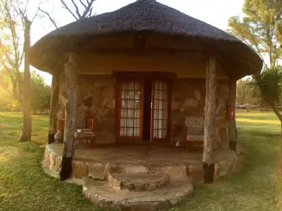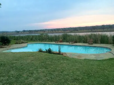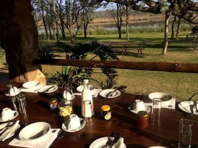 I had arrived at Horizon Ranch in the evening when it was already dark, and although I was instantly charmed by the comfort and attention to detail (petals on the bed!) in my rondavel, I hadn’t had a chance to see much of where I was. So I woke up to the sounds of the birdlife outside at 6am the next morning like a little kid on Christmas morning, excited to begin experiencing my African adventure. The peek out my window didn’t disappoint, as I glimpsed the large dam that was home to the hippos I heard, and the lovely pool and lawn dotted with day beds. I sat on the porch of my cozy chalet and enjoyed a cup of tea until Sophie arrived with her wakeup call, which she would deliver every morning at 7am in preparation for breakfast at 7:30 before our first ride at 8am. This morning in my exuberance I dashed to the main lodge where breakfast is served on the porch, getting there far earlier than the other guests, but giving me time to enjoy watching the horses being served their own breakfast outside the stable next door.