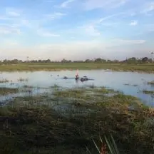 I had some of the most exciting moments by horseback of my life riding in the delta – elephants shaking their heads and flapping their ears at us, considering a mock charge, or even more terrifying to our horses, ground birds startling up from beneath their hooves. One morning in the path ahead I saw a feline character: “A leopard!” our guide, Rodgers, told us, and we trotted behind him as he went to get a better look. He saw that there were two, and they went off into the tall grass to our left. Knowing that a leopard is not likely to be aggressive toward a horse in the way that a lion would be, Rodgers ventured into the grass to try to flush one out and away from us so that we could get a better look.
