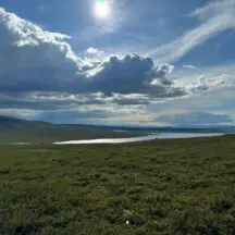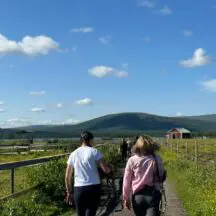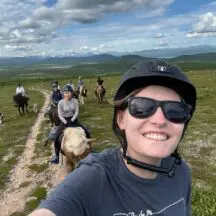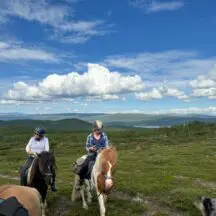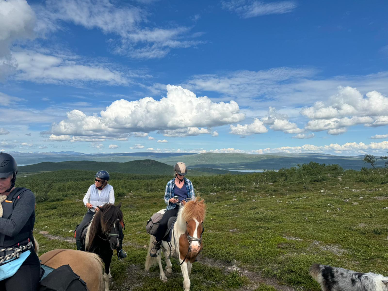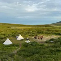 This is a circular point to point ride that begins and ends at the farmhouse. Our first day was – I think – a seven-hour trek to the teepees – the longest of our 5 rides – not including the hour and a half lunch break (Jennie also cooked all the lunches, over a campfire). Hanna brought along her two terrific Australian sheepdogs, and cooking gear/food was carried by our trusty pack horse, who ran free, often wandering off to take in the views. The ride was long, but comfortable, walking, tolting, and trotting, with some dismounts to lead our horses through over bogs, over narrow plank bridges, or at a few especially steep spots. The arctic landscapes varied from birch forest to beautiful vernal pools, bogs, low-growing scrub, and, rarely, rock. There were zero issues with horses or riders. This is a great ride for intermediate or advanced riders – the distance is challenging but the horses and terrain are not. Although there were no official canters (and no gallops) you can always take one on your own. Our guides were helpful and always available to answer questions or check your girth, but Jennie and Hannah really are trying to give you as much freedom as possible, and, I think, build your self-confidence. You pick your own pace and position in the group, and most of the riding is in wide-open spaces past the tree line- sort of like high meadow riding, without the grass. I didn’t hear any corrections of anyone’s riding style – though maybe we had an especially trustworthy group? Every member of the group was an interesting, pleasant, competent person.