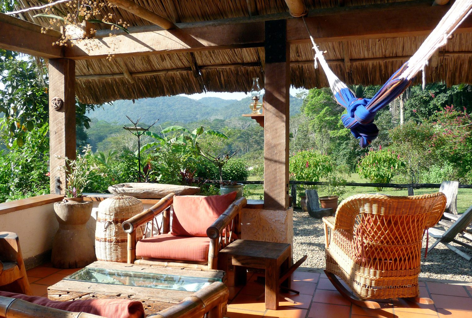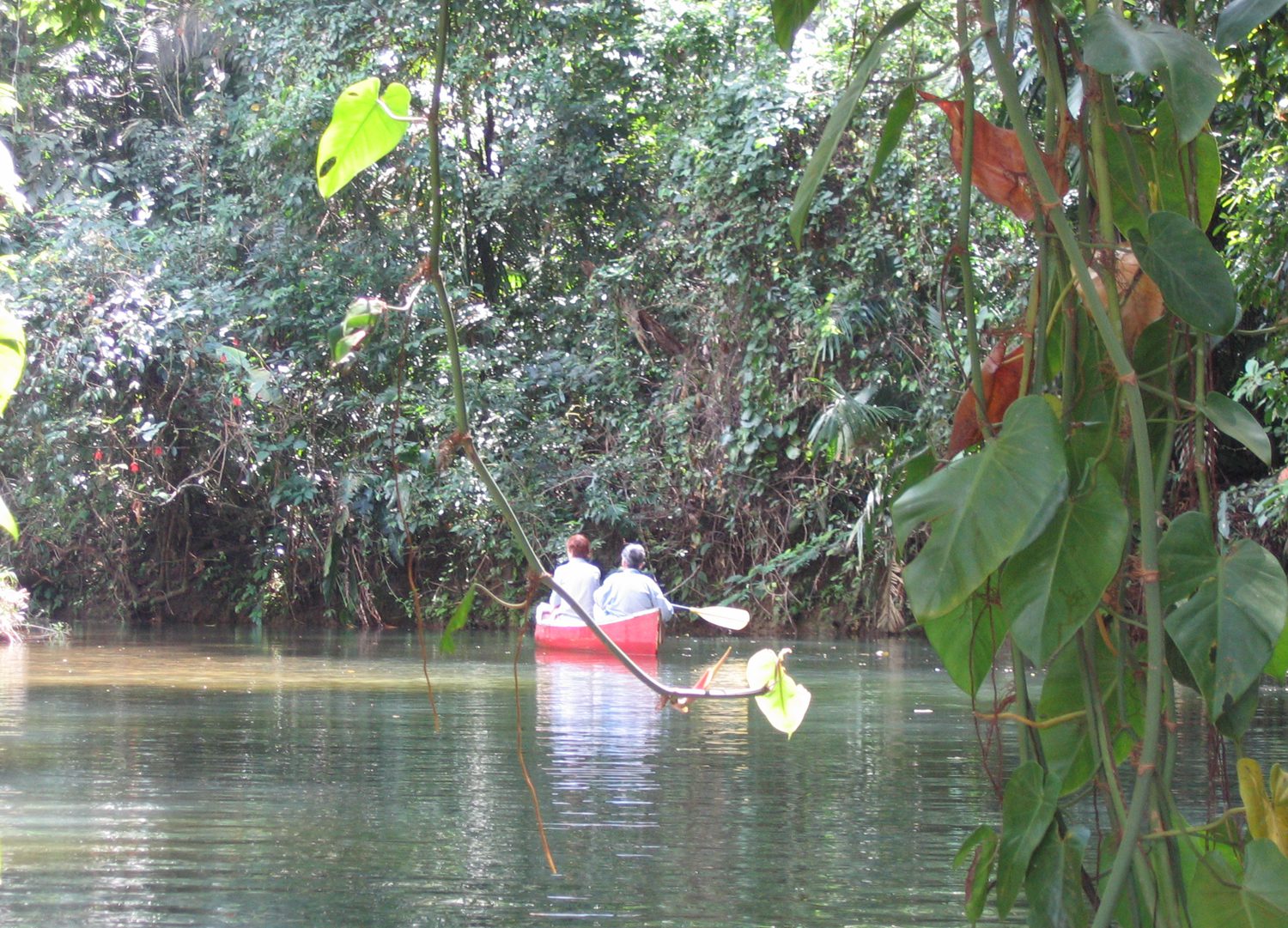 Our guide, Rigo, was quick to teach us all about the vegetation along the trails. He wielded his machete at times to clear the path and, on other occasions, to cut chunks of a water vine so we could experience sipping sweet water from this plant. He pointed out the many colorful birds flitting around in the lush forest canopy of ferns, philodendron and palms. Many of the plants were in bloom; hibiscus, lady’s lips, orchids and bougainvillea, all lending a tantalizing aroma to the jungle air.