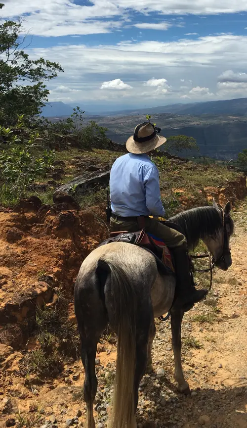 Upon pickup from the Bogota airport we were transferred to a ranch in the Valley Verde area, about 2 hours outside Bogota where we would spend the first two days of riding. From there we transferred to the town of Oiba for the first night of the Barichara ride. The only unfortunate situation was that the hotel was situated along a busy highway so rest was not easy to come by in the rooms of the hotel facing the highway. The next morning we received our safety briefing during breakfast before we set off on the fresh horses on our way to the town of Charala. The horses were quite excited to be starting the trail and all having been used for endurance were ready to go so you definitely have to be a confident rider. Up and down steep mountain trails we could appreciate the horses’ endless energy as they would be needing it for the weeks trail. We rode through lush vegetation along the hillsides and enjoyed vast views of the surrounding mountains. At our lunch stop a strong thunderstorm developed with a downpour. Fortunately we were able to wait out the worst of the storm while playing Teja, a game like horseshoes but with rocks which is played by the locals to pass time.